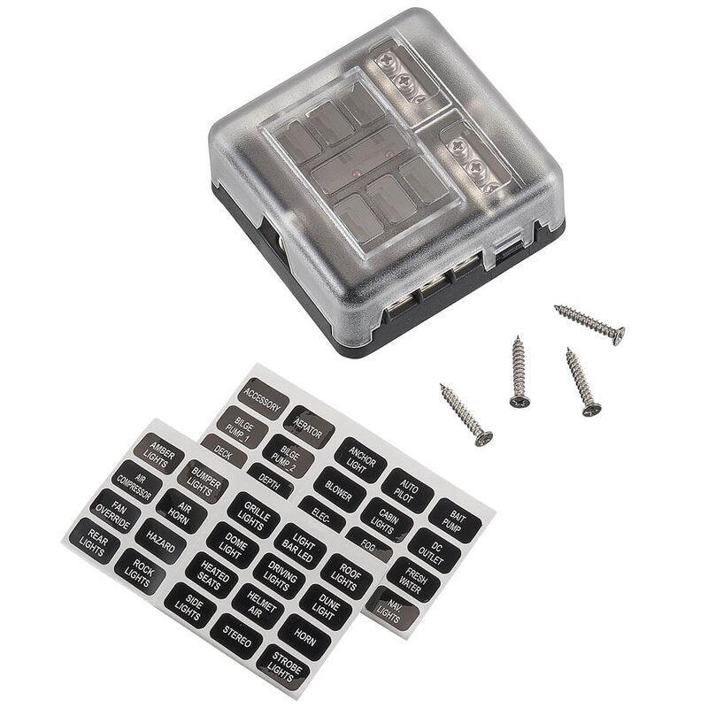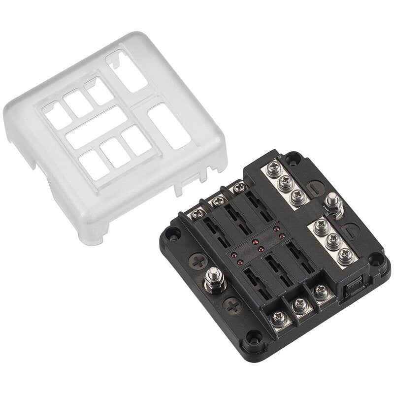 Porte-fusible à lame pour voiture avec LED et connexion négative (6 fusibles 30A/32V DC, connexion à vis)